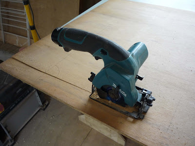 The first cut, thats a Makita 10.6 volt cordless circular saw, nice tool, very accurate, light and easy to use. Its great on plywood up to about 12mm.