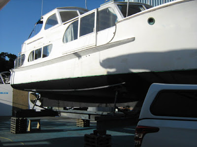 The Marina crew waterblasted her to get most of the rubbish off her underwater sections, which was very effective. Once perched up on her cradle, it was” into it“ with the tungsten tipped scraper and sandpaper. By the end of day one I had most of the bottom scraped off, had wet sanded it to tidy the surface up, had begun the application of the underwater primer paint, and had shoulders that felt as though Atlas had been using them to hold the planet up.